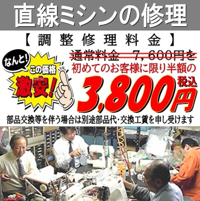 ┏★☆★☆━━━━━━━━━━━━━━━┓ 修 理 の お 申 込 み は お 電 話 で 承 り ま す ┗━━━━━━━━━━━━━━━☆★☆★┛ 【 ミ シ ン 修 理 技 術 料 金 】 調 整 修 理 費 ⇒ 11,600円 (税込) を ▼ 初回のお客様に限り ⇒ 5,800円 (税込) で \ 出 張 費 は 限 定 地 域 サ ー ビ ス / ※注) 初回のお客様は受付時にお伝えください。 ※注) 部品交換を伴う場合は別途申し受けます。 ※注) 分解は修理スタッフにお尋ねください。 ※注) 修理不可能な場合は料金は頂きません。 _/_/_/_/_/_/_/_/_/_/_/_/_/_/_/ 調整修理は部品交換を伴わない修理で分解や 外装カバーの取外しを行わない簡易修理です。 ご指定のご住所へ地域担当の修理スタッフが、 迅速にお伺いして親切丁寧に調整いたします。 作業時間は最短で約30分で終了いたします。 ※注) 重度の場合はお預かり修理となります。 +++★ 早くて、安くて、安心、便利です ★+++ ◎ 部品交換などが必要な場合は、お見積りを いたしますので、ご検討された上で 部品交換を行いますのでご安心ください。 ◎ オーバーホールも別途承りますので、 詳しくは修理スタッフにお尋ねください。 _/_/_/_/_/_/_/_/_/_/_/_/_/_/_/ .
