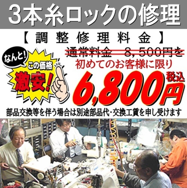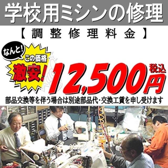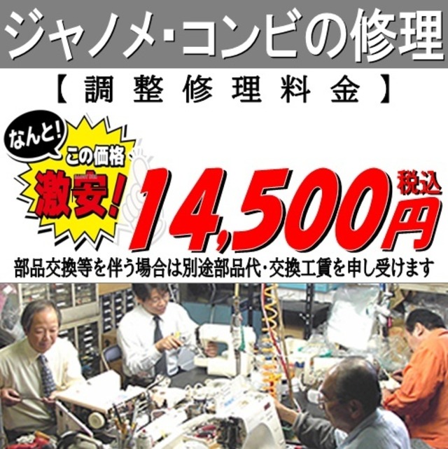 ┏★☆★☆━━━━━━━━━━━━━━━┓ あ な た の ミ シ ン の 修 理 屋 さ ん で す ┗━━━━━━━━━━━━━━━☆★☆★┛ 【 ミ シ ン 修 理 技 術 料 金 】 調整修理 ( 出張込 ) ⇒ 10,500円 (税込) を ▼ \ 初回 お客様に限り ⇒ 8,800円 (税込) / ※注) 部品交換を伴う場合は別途申し受けます。 ※注) 分解は修理スタッフにお尋ねください。 ※注) 修理不可能な場合は料金は頂きません。 _/_/_/_/_/_/_/_/_/_/_/_/_/_/_/ 調整修理は部品交換を伴わない修理で分解や 外装カバーの取外しを行わない簡易修理です。 ご指定のご住所へ地域担当の修理スタッフが、 迅速にお伺いして親切丁寧に調整いたします。 作業時間は最短で約30分で終了いたします。 ※注) 重度の場合はお預かり修理となります。 +++★ 早くて、安くて、安心、便利です ★+++ ◎ 部品交換などが必要な場合は、お見積りを いたしますので、ご検討された上で 部品交換を行いますのでご安心ください。 ◎ オーバーホールも別途承りますので、 詳しくは修理スタッフにお尋ねください。 _/_/_/_/_/_/_/_/_/_/_/_/_/_/_/ .