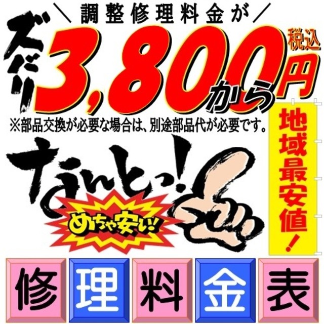 _/_/_/_/_/_/_/_/_/_/_/_/_/_/_/ 【 家 庭 用 ミ シ ン の 修 理 料 金 】 ┏★☆★☆━━━━━━━━━━━━━━━┓ 事前に調整修理料金の目安がわかりますので、 メーカー名・機種名と症状をお教えください。 注) 海外製でお取り扱いできない機種もあり! ┗━━━━━━━━━━━━━━━☆★☆★┛ ┏★☆★☆━━━━━━━━━━━━━━━┓ 【 直 線 ミ シ ン の 料 金 】 調整修理 ( 出張費込 ) ⇒ 5,500円 (税込) を ▼ \ 初回 お客様に限り ⇒ 3,800円 (税込) / ーーーーーーーーーーーーーーーーーーーーー 【 2 本 糸 ロ ッ ク ミ シ ン の 料 金 】 調整修理 ( 出張費込 ) ⇒ 6,500円 (税込) を ▼ \ 初回 お客様に限り ⇒ 4,800円 (税込) / ーーーーーーーーーーーーーーーーーーーーー 【 電 動 ミ シ ン の 料 金 】 調整修理 ( 出張費込 ) ⇒ 6,500円 (税込) を ▼ \ 初回 お客様に限り⇒ 4,800円 (税込) / ーーーーーーーーーーーーーーーーーーーーー 【 電 子 ミ シ ン の 料 金 】 調整修理 ( 出張費込 ) ⇒ 7,500円 (税込) を ▼ \ 初回 お客様に限り⇒ 5,800円 (税込) / ーーーーーーーーーーーーーーーーーーーーー 【 3 本 糸 ロ ッ ク ミ シ ン の 料 金 】 調整修理 ( 出張費込 ) ⇒ 8,500円 (税込) を ▼ \ 初回 お客様に限り ⇒ 6,800円 (税込) / ーーーーーーーーーーーーーーーーーーーーー 【 コ ン ピ ュ ー タ ー ミ シ ン の 料 金 】 調整修理 ( 出張費込 ) ⇒ 8,500円 (税込) を ▼ \ 初回 お客様に限り ⇒ 6,800円 (税込) / ーーーーーーーーーーーーーーーーーーーーー 【 職 業 用 ミ シ ン の 料 金 】 調整修理 ( 出張費込 ) ⇒ 9,500円 (税込) を ▼ \ 初回 お客様に限り ⇒ 7,800円 (税込) / ーーーーーーーーーーーーーーーーーーーーー 【 4 本 糸 ロ ッ ク ミ シ ン の 料 金 】 調整修理 ( 出張込 ) ⇒ 10,500円 (税込) を ▼ \初回お客様に限り⇒ 8,800円 (税込) / ーーーーーーーーーーーーーーーーーーーーー 【 ウ ェ ー ブ ロ ッ ク ミ シ ン の 料 金 】 調整修理 ( 出張込 ) ⇒ 11,500円 (税込) ~ ▼ \初回お客様に限り⇒ 9,800円 (税込) / ーーーーーーーーーーーーーーーーーーーーー 【 学 校 用 ミ シ ン の 料 金 】 調整修理 ( 出張込 ) ⇒ 12,500円 (税込) ~ ーーーーーーーーーーーーーーーーーーーーー 【 ジ ャ ノ メ・コ ン ビ ミ シ ン の 料 金 】 調整修理 ( 出張込 ) ⇒ 14,500円 (税込) ~ ーーーーーーーーーーーーーーーーーーーーー 【 刺 繡 機 付 き ミ シ ン の 料 金 】 調整修理 ( 出張込 ) ⇒ 16,500円 (税込) ~ ーーーーーーーーーーーーーーーーーーーーー ※注) 部品交換を伴う場合は別途申し受けます。 ※注) 調整修理は分解せず行なう簡易修理です。 ※注) 分解は修理スタッフにお尋ねください。 ※注) 修理不可能な場合は料金は頂きません。 ┗━━━━━━━━━━━━━━━☆★☆★┛ ⌖꙳✧˖°⌖꙳✧˖°⌖꙳✧˖°⌖꙳✧˖°⌖꙳✧˖°⌖꙳✧˖°⌖꙳✧˖°⌖ 【 修 理 取 り 扱 い メ ー カ ー 】 ジャノメ ・ ブラザー ・ ジューキ ・ シンガー ヤマザキ ・ セレガー ・ トヨタ ・ リッカー マミーロック・ ベビーロック _/_/_/_/_/_/_/_/_/_/_/_/_/_/_/ ┏★☆★☆━━━━━━━━━━━━━━━┓ 修 理 の お 申 込 み は お 電 話 で 承 り ま す ┗━━━━━━━━━━━━━━━☆★☆★┛ あなたのミシンの修理屋さん 川 越 ミ シ ン 修 理 サ ー ビ ス 埼玉県川越市霞ヶ関東1-4-11 【 ミ シ ン 修 理 の お 申 し 込 み は 】 ☎ 0 1 2 0 - 4 1 - 3 4 8 0 ------------------------------------------ 受付時間 / 10時00分 ~ 16時00分 休業日 / 年中無休 ( 月曜日臨時休業あり ) _/_/_/_/_/_/_/_/_/_/_/_/_/_/_/ .