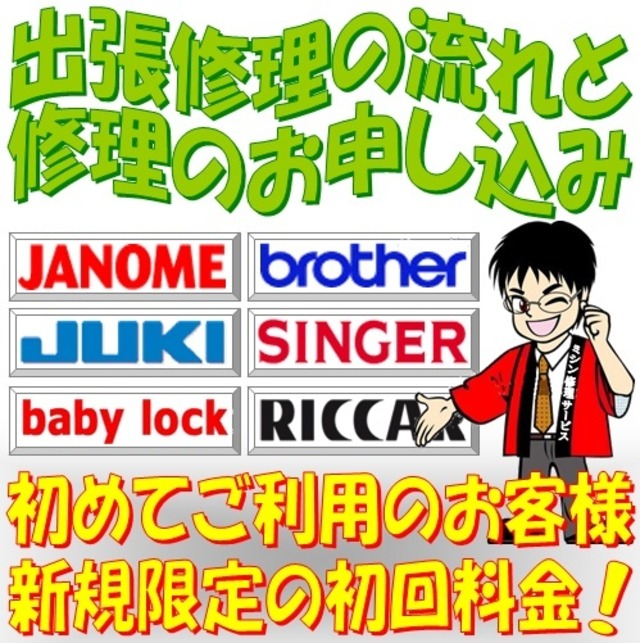 _/_/_/_/_/_/_/_/_/_/_/_/_/_/_/ 【 出 張 修 理 ご 依 頼 の 流 れ 】 ┏━━━┓ ┃① 家庭用ミシンの調整修理などのご依頼は、 ┗━━━┛必ずお電話でお申し込みください。 ※ ご訪問日はご予約制となります。 ▼ 【 通 話 料 無 料 の フ リ ー ダ イ ヤ ル 】 ☎ 0 1 2 0 - 4 1 - 3 4 8 0 ▼ ┏━━━┓ ┃② メーカー名と機種名、又は購入年度と、 ┗━━━┛故障内容をお教えください。 ※ 修理料金の目安がわかります。 ※ 詳しくは料金表をご覧ください。 ▼ ┏━━━┓ ┃③ ご訪問のご希望日をお申し出ください。 ┗━━━┛お申し込み順のため、ご希望に 沿えない場合もございますので、 何卒ご了承ください。 ▼ ┏━━━┓ ┃④ お客様のご指定場所に地域担当の ┗━━━┛修理スタッフがお伺い致します。 作業時間は30~60分で完了。 ※ 修理完了後に必ずご使用者さまに 試し縫い確認をお願い致します。 ┏★☆★☆━━━━━━━━━━━━━━━┓ 万が一! 直らない場合は、 料金などは一切いただきません。 ┗━━━━━━━━━━━━━━━☆★☆★┛ 修理の作業時間は、お伺いして約1時間以内で 作動確認後完了です。( 重度はお預かりで修理 ) ------------------------------------------ 部品交換が必要な場合は、作業前に交換工賃が わかるので安心です。( 部品代+分解取付別途 ) ⌖꙳✧˖°⌖꙳✧˖°⌖꙳✧˖°⌖꙳✧˖°⌖꙳✧˖°⌖꙳✧˖°⌖꙳✧˖°⌖ 【 修 理 取 り 扱 い メ ー カ ー 】 ジャノメ ・ ブラザー ・ ジューキ ・ シンガー ヤマザキ ・ セレガー ・ トヨタ ・ リッカー マミーロック・ ベビーロック _/_/_/_/_/_/_/_/_/_/_/_/_/_/_/ ┏★☆★☆━━━━━━━━━━━━━━━┓ 修 理 の お 申 込 み は お 電 話 で 承 り ま す ┗━━━━━━━━━━━━━━━☆★☆★┛ あなたのミシンの修理屋さん 川 越 ミ シ ン 修 理 サ ー ビ ス 埼玉県川越市霞ヶ関東1-4-11 【 ミ シ ン 修 理 の お 申 し 込 み は 】 ☎ 0 1 2 0 - 4 1 - 3 4 8 0 ------------------------------------------ 受付時間 / 10時00分 ~ 16時00分 休業日 / 年中無休 ( 月曜日臨時休業あり ) _/_/_/_/_/_/_/_/_/_/_/_/_/_/_/ .