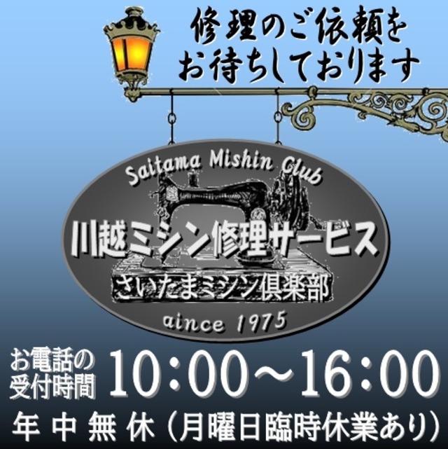 _/_/_/_/_/_/_/_/_/_/_/_/_/_/_/ 【 持 ち 込 み 修 理 終 了 の お 知 ら せ 】 持ち込み修理のお客様が年々減少のためと 出張修理のご依頼が大変多いために、 持ち込み修理の受付は終了となりました。 長年にわたり、ありがとうございました。 今後は事務所へのミシンの持ち込み修理は、 対応できませんので何卒ご了承ください。 _/_/_/_/_/_/_/_/_/_/_/_/_/_/_/ ┏★☆★☆━━━━━━━━━━━━━━━┓ 修 理 の お 申 込 み は お 電 話 で 承 り ま す ┗━━━━━━━━━━━━━━━☆★☆★┛ あなたのミシンの修理屋さん 川 越 ミ シ ン 修 理 サ ー ビ ス 埼玉県川越市霞ヶ関東1-4-11 【 ミ シ ン 修 理 の お 申 し 込 み は 】 ☎ 0 1 2 0 - 4 1 - 3 4 8 0 ------------------------------------------ 受付時間 / 10時00分 ~ 16時00分 休業日 / 年中無休 ( 月曜日臨時休業あり ) _/_/_/_/_/_/_/_/_/_/_/_/_/_/_/ .