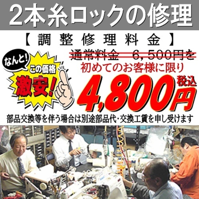 ┏★☆★☆━━━━━━━━━━━━━━━┓ あ な た の ミ シ ン の 修 理 屋 さ ん で す ┗━━━━━━━━━━━━━━━☆★☆★┛ 【 ミ シ ン 修 理 技 術 料 金 】 調整修理 ( 出張費込 ) ⇒ 7,500円 (税込) を ▼ \ 初回 お客様に限り ⇒ 5,800円 (税込) / ※注) 部品交換を伴う場合は別途申し受けます。 ※注) 分解は修理スタッフにお尋ねください。 ※注) 修理不可能な場合は料金は頂きません。 _/_/_/_/_/_/_/_/_/_/_/_/_/_/_/ 調整修理は部品交換を伴わない修理で分解や 外装カバーの取外しを行わない簡易修理です。 ご指定のご住所へ地域担当の修理スタッフが、 迅速にお伺いして親切丁寧に調整いたします。 作業時間は最短で約30分で終了いたします。 ※注) 重度の場合はお預かり修理となります。 +++★ 早くて、安くて、安心、便利です ★+++ ◎ 部品交換などが必要な場合は、お見積りを いたしますので、ご検討された上で 部品交換を行いますのでご安心ください。 ◎ オーバーホールも別途承りますので、 詳しくは修理スタッフにお尋ねください。 _/_/_/_/_/_/_/_/_/_/_/_/_/_/_/ .