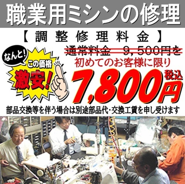 ┏★☆★☆━━━━━━━━━━━━━━━┓ あ な た の ミ シ ン の 修 理 屋 さ ん で す ┗━━━━━━━━━━━━━━━☆★☆★┛ 【 ミ シ ン 修 理 技 術 料 金 】 調整修理 ( 出張費込 ) ⇒ 9,500円 (税込) を ▼ \ 初回 お客様に限り ⇒ 7,800円 (税込) / ※注) 部品交換を伴う場合は別途申し受けます。 ※注) 分解は修理スタッフにお尋ねください。 ※注) 修理不可能な場合は料金は頂きません。 _/_/_/_/_/_/_/_/_/_/_/_/_/_/_/ 調整修理は部品交換を伴わない修理で分解や 外装カバーの取外しを行わない簡易修理です。 ご指定のご住所へ地域担当の修理スタッフが、 迅速にお伺いして親切丁寧に調整いたします。 作業時間は最短で約30分で終了いたします。 ※注) 重度の場合はお預かり修理となります。 +++★ 早くて、安くて、安心、便利です ★+++ ◎ 部品交換などが必要な場合は、お見積りを いたしますので、ご検討された上で 部品交換を行いますのでご安心ください。 ◎ オーバーホールも別途承りますので、 詳しくは修理スタッフにお尋ねください。 _/_/_/_/_/_/_/_/_/_/_/_/_/_/_/ .